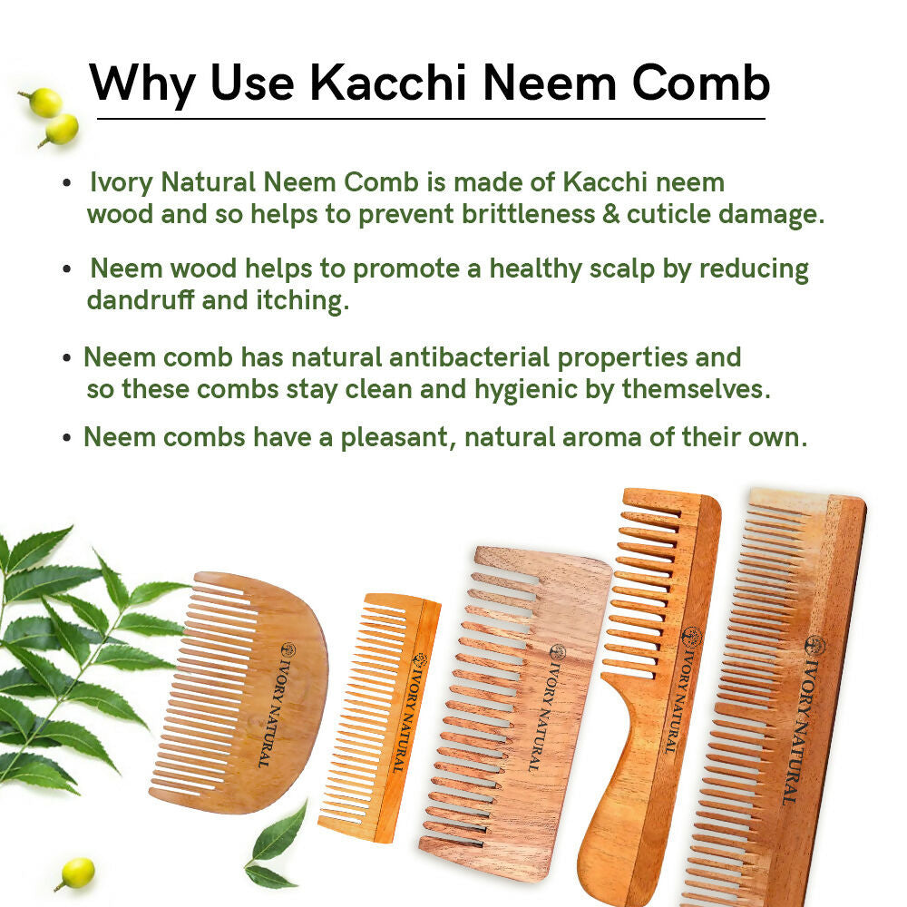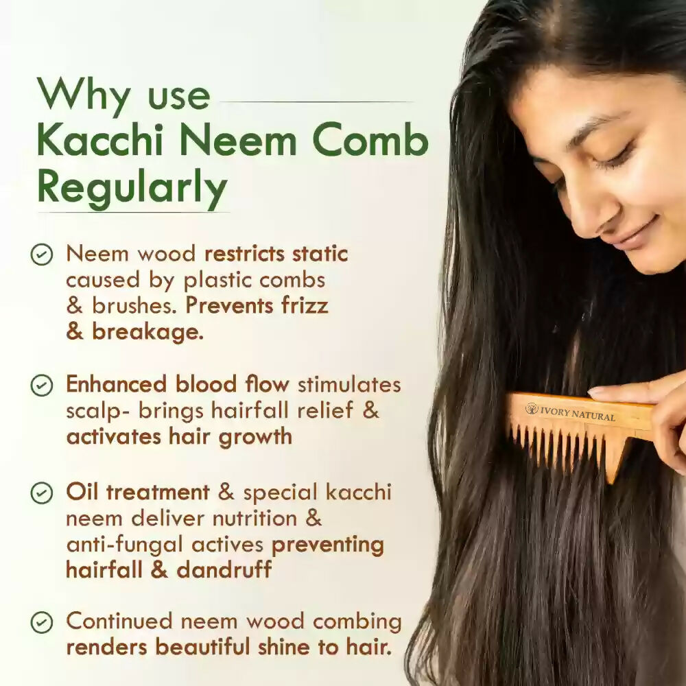 Ivory Natural Premium Dual Tooth Kacchi Neem Wooden Comb! This comb is crafted from the finest neem wood, ensuring quality and durability. With its unique design, it effortlessly untangles hair while promoting its overall hair wellness. The dual tooth feature allows for smooth combing, reducing the risk of hair breakage. Suitable for all hair types, it leaves your hair feeling smooth and free from static. Embrace the natural benefits of neem with every stroke, ensuring a comfortable and enjoyable hair care experience.