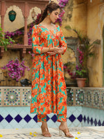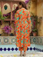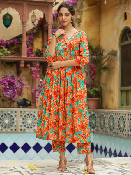 Janasya Orange Cotton Floral Kurta & Bottom