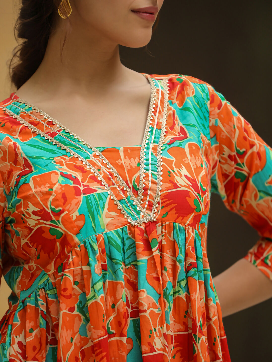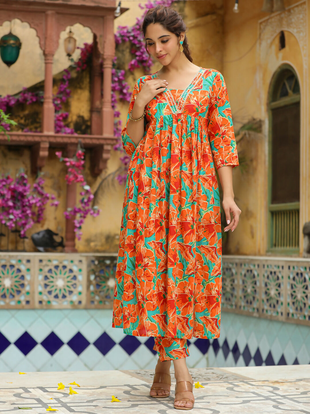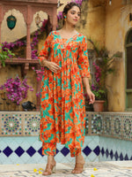 Janasya Orange Cotton Floral Kurta & BottomAbout the Product: Package Contains: 1 Kurta :: 1 Bottom Top Fabric: Cotton Top Style Type: Gathe...