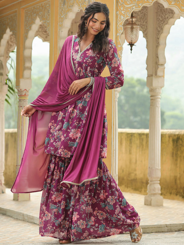 Janasya Purple Georgette Floral Kurta,Bottom & Dupatta