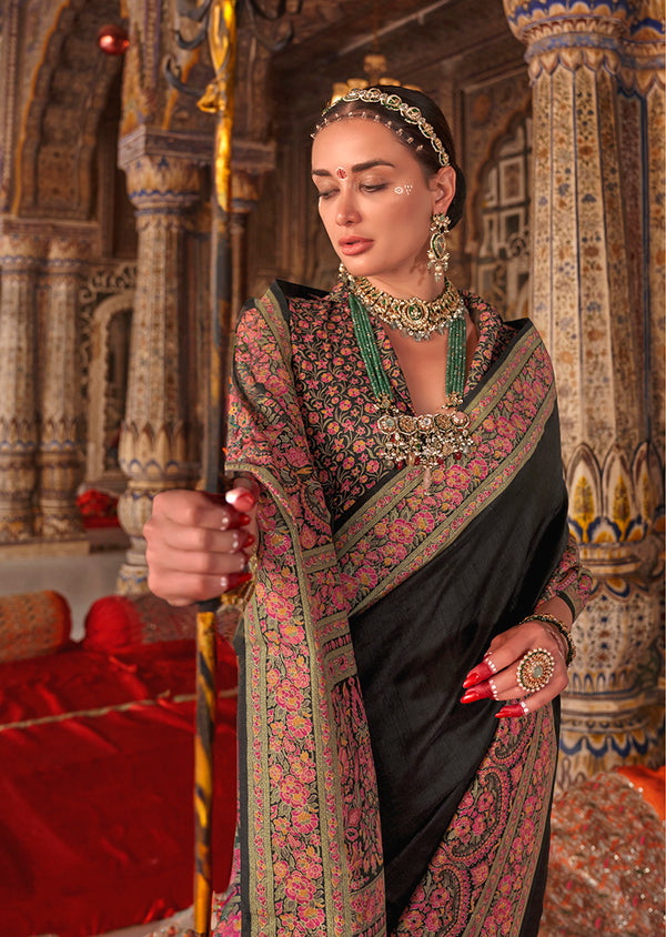 Monjolika Fashion Black Silk Blend Print Work Traditional Saree for Ceremonial