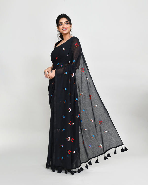 Piyari Fashion Women's Black Exclusive Embroidery Saree With Tassels