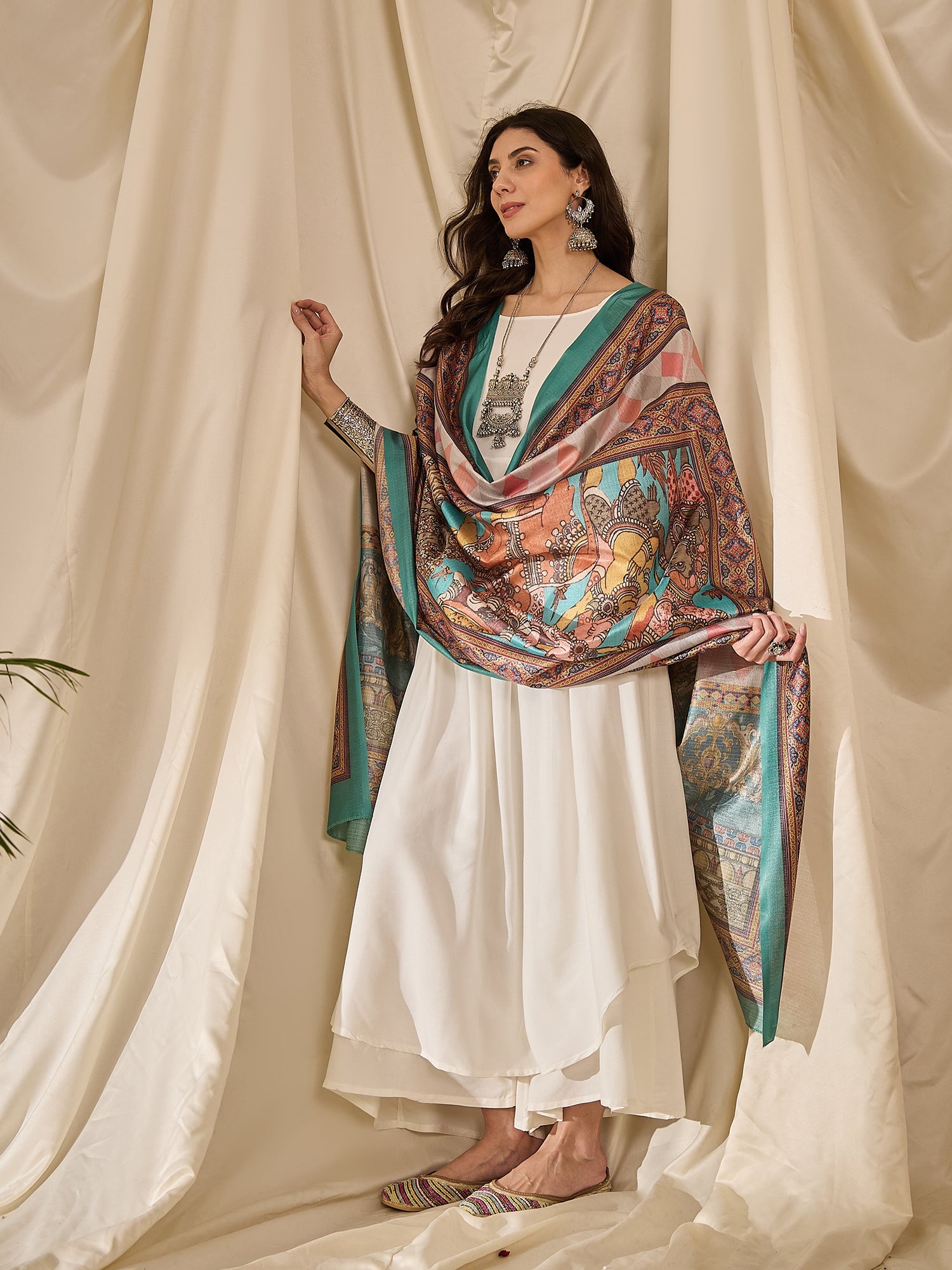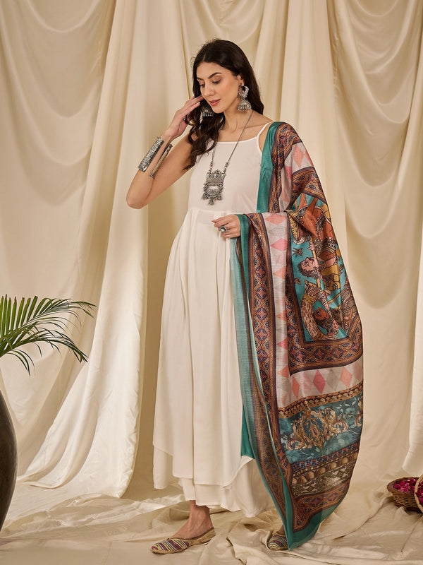 This set features a chic, sleeveless white kurta with a modern strappy design, offering a fresh and airy look. Paired with a vibrant dupatta adorned with intricate traditional patterns, it adds a pop of color and cultural flair.