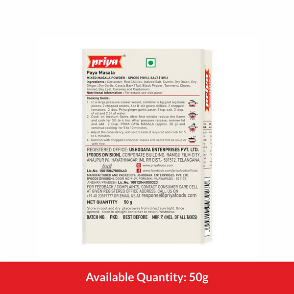 Priya Paya MasalaAbout the Product:Priya Paya Masala, crammed with the goodness of aromatic spices pounded finely, helps you recreate the glory of ...