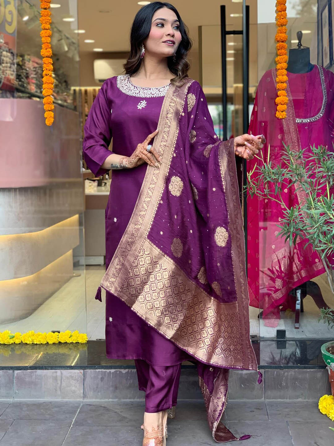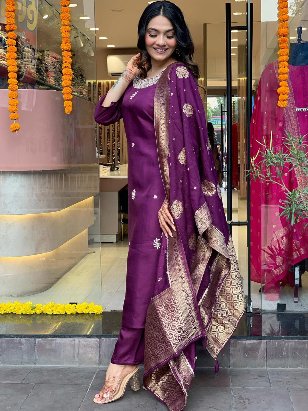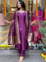 Purple printed Kurta with Trousers & dupatta