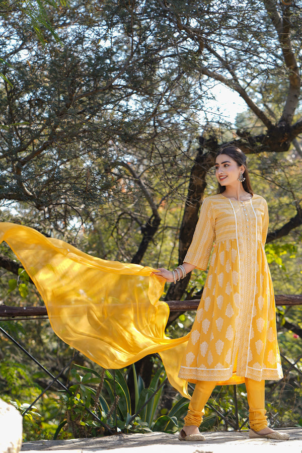 Juniper Women Yellow Georgette Printed Flared Kurta Sets Shape: FlaredTop: Georgette; Bottom: Shantoon; Dupatta: Nylon Chiffon Color: Yellow Wor...