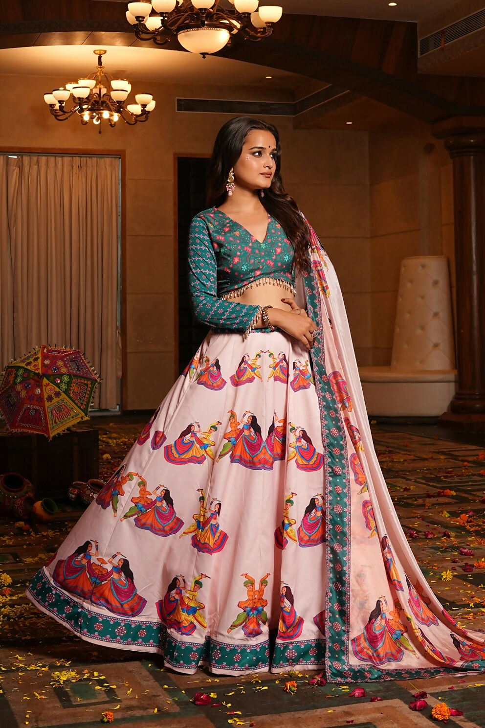 AI Fashion Light Pink Crepe Designer Navratri Wear Lehenga Choli CollectionAbout the Product: Lehenga Color : Light Pink Blouse Color : Teal Dupatt...