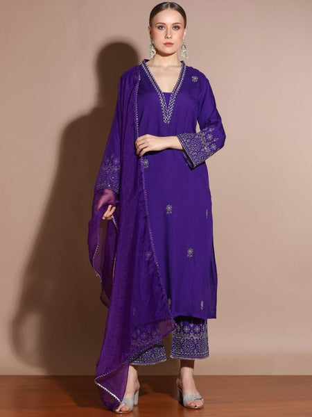 Purple & gold toned embroidered Kurta with Palazzos & dupatta