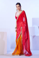 This delightful diva accoutre features unique styling and unusual material. Get the simplicity and grace with this orange & red colour satin moss designer saree. The lovely lace work throughout the attire is awe inspiring. Comes with matching blouse. (Slight variation in color, fabric & work is possible. Model images are only representative.)Legal Disclaimer :Product color may slightly vary due to photographic lighting sources or your monitor settings.