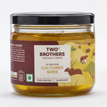Two Brothers Organic Farms A2 Gir Cow Cultured Ghee is prepared using the traditional Bilona method. This handcrafted ghee is made from the milk of Gir cows that are cared for on the farm. The process begins with converting fresh milk into curd using a natural starter culture. The curd is then hand-churned to obtain butter, which is slowly heated on a wood fire to produce pure golden ghee.