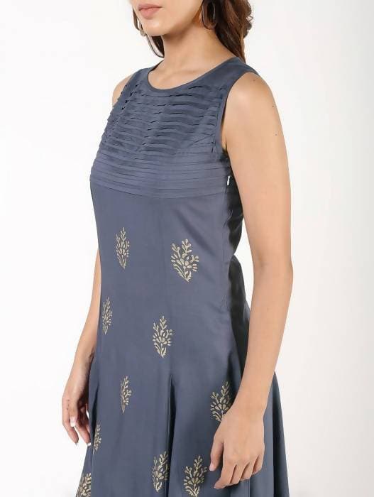 Aniyah Rayon Block Print Flared Grey Kurta :