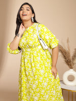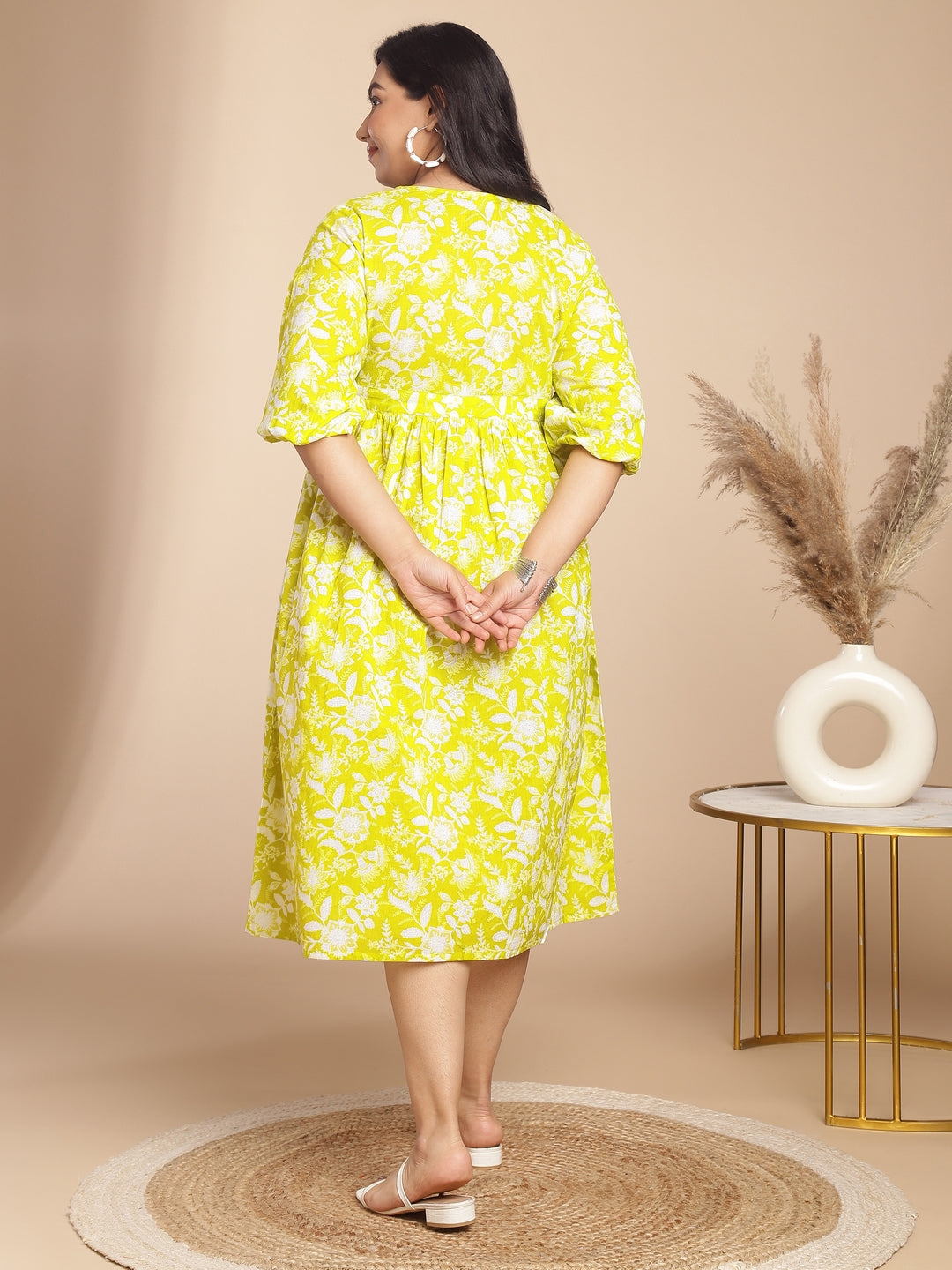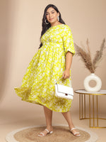 Janasya Gathering Cambric Lime Floral Round Neck Dress - 3XL