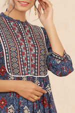 Indigo rayon maxi dress with floral print and lace work. Features mandarin collar, balloon sleeves, and hook & eye closure. Perfect for daily wear.