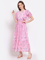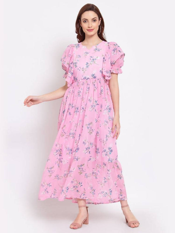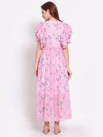 Myshka Women's Pink Printed Georgette Half Sleeve Round Neck Casual Dress Base Fabric: Georgette Fabric: Georgette Base Color: Pink Pattern: Pr...