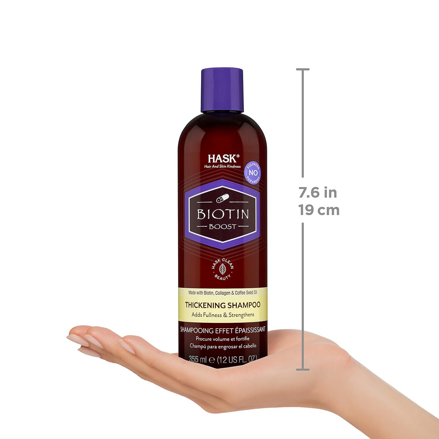 Transform fine, flat strands into volumized, fuller hair with HASK Biotin Boost Thickening Shampoo. Infused with biotin, collagen, and coffee to help promote stronger, thicker-looking hair. Go big or go home! With biotin, collagen, and coffee, this plumping trio will enhance the appearance of thicker hair without leaving it feeling heavy.