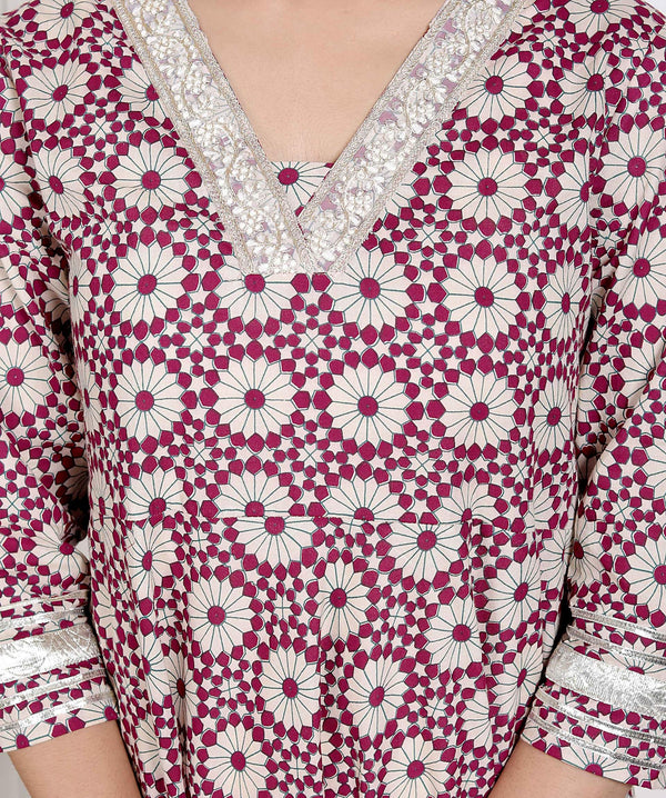 Update your look with this captivating cream-colored embroidered kurta with dupatta from Miravan. Made from high-quality Cotton, this piece features 3/4th sleeves and a v neckline. Style it with minimal jewellery and sandals to complete the ensemble.