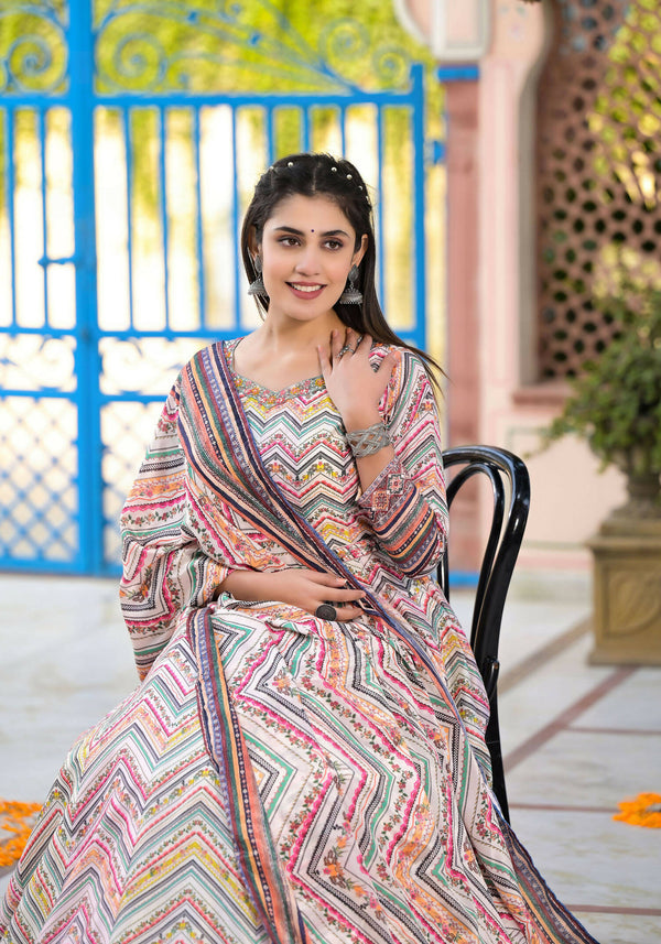 Functional Designer Off White-Muliti Dola Silk Anarkali suit with Dupatta - Ramya - Distacart