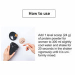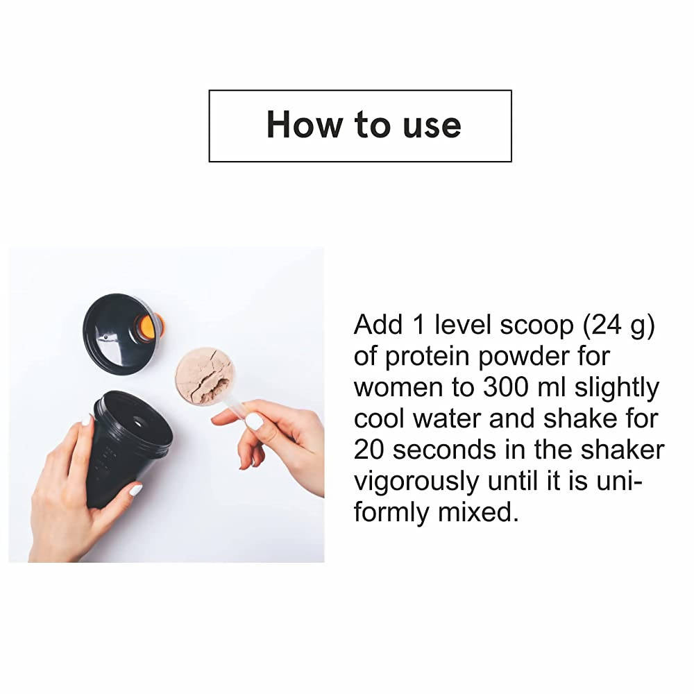 • Add 1 level scoop (24 g) of protein powder for women to 300 ml slightly cool water and shake for 20 seconds in the shaker vigorously until it is uniformly mixed.