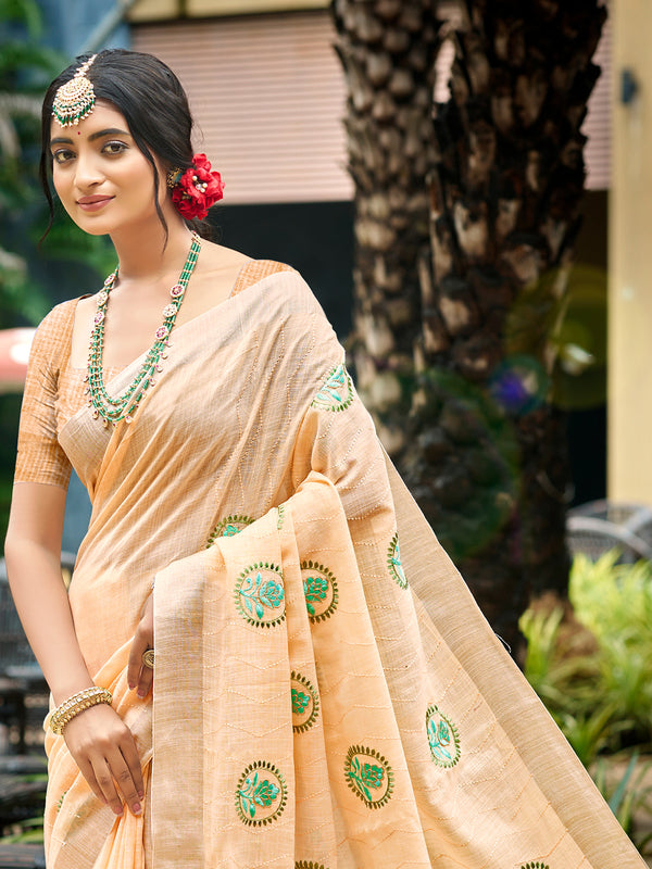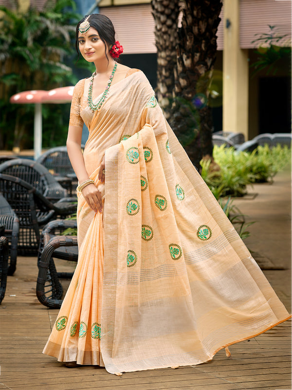Sangam Prints Peach Linen Woven Work Traditional Saree - Free Size