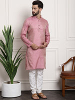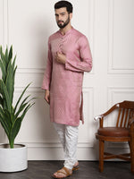 Pink and golden straight knee length kurta, has a mandarin collar, long sleeves, straight hem