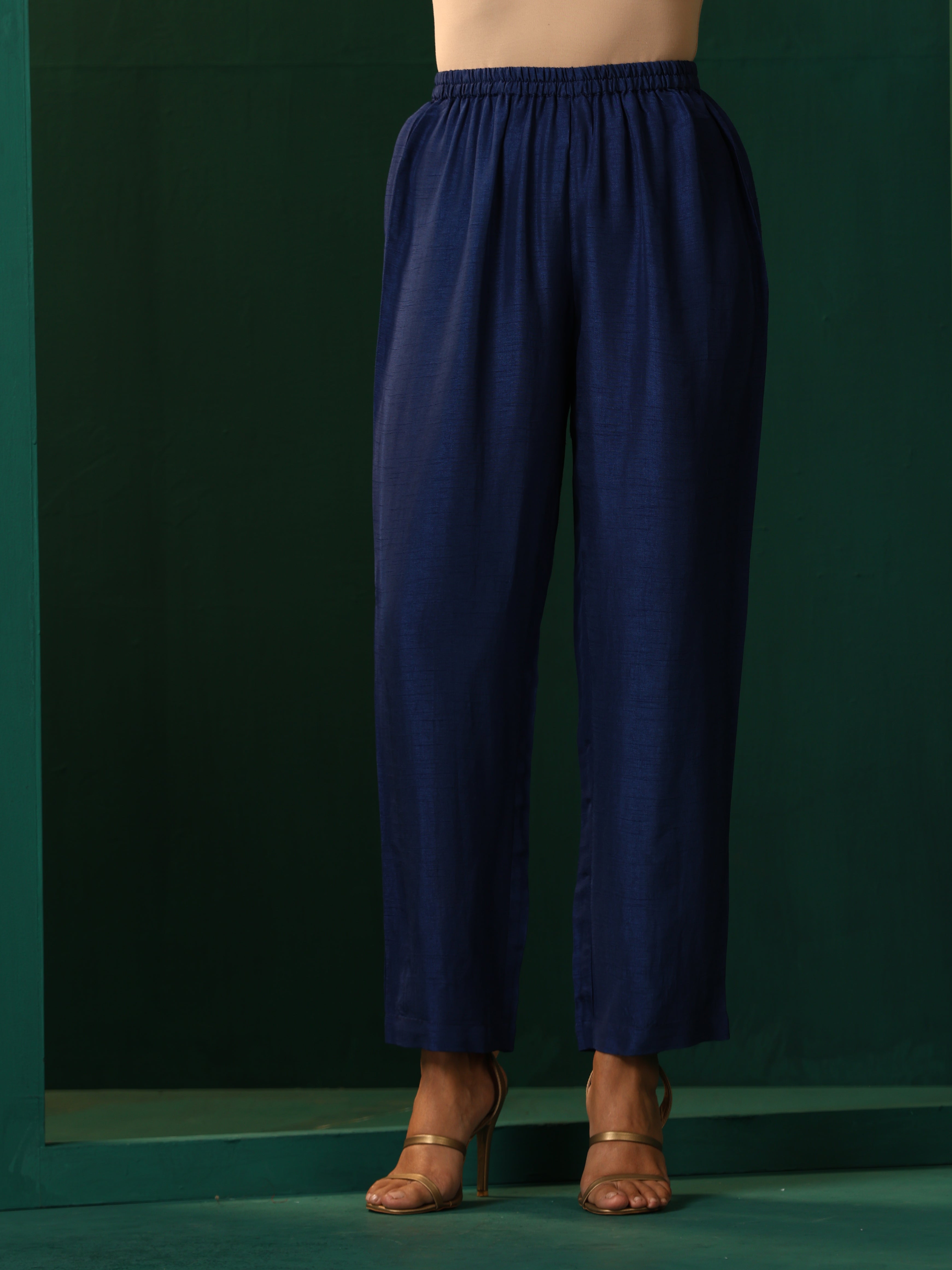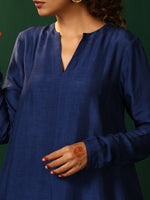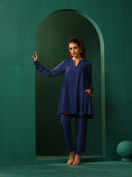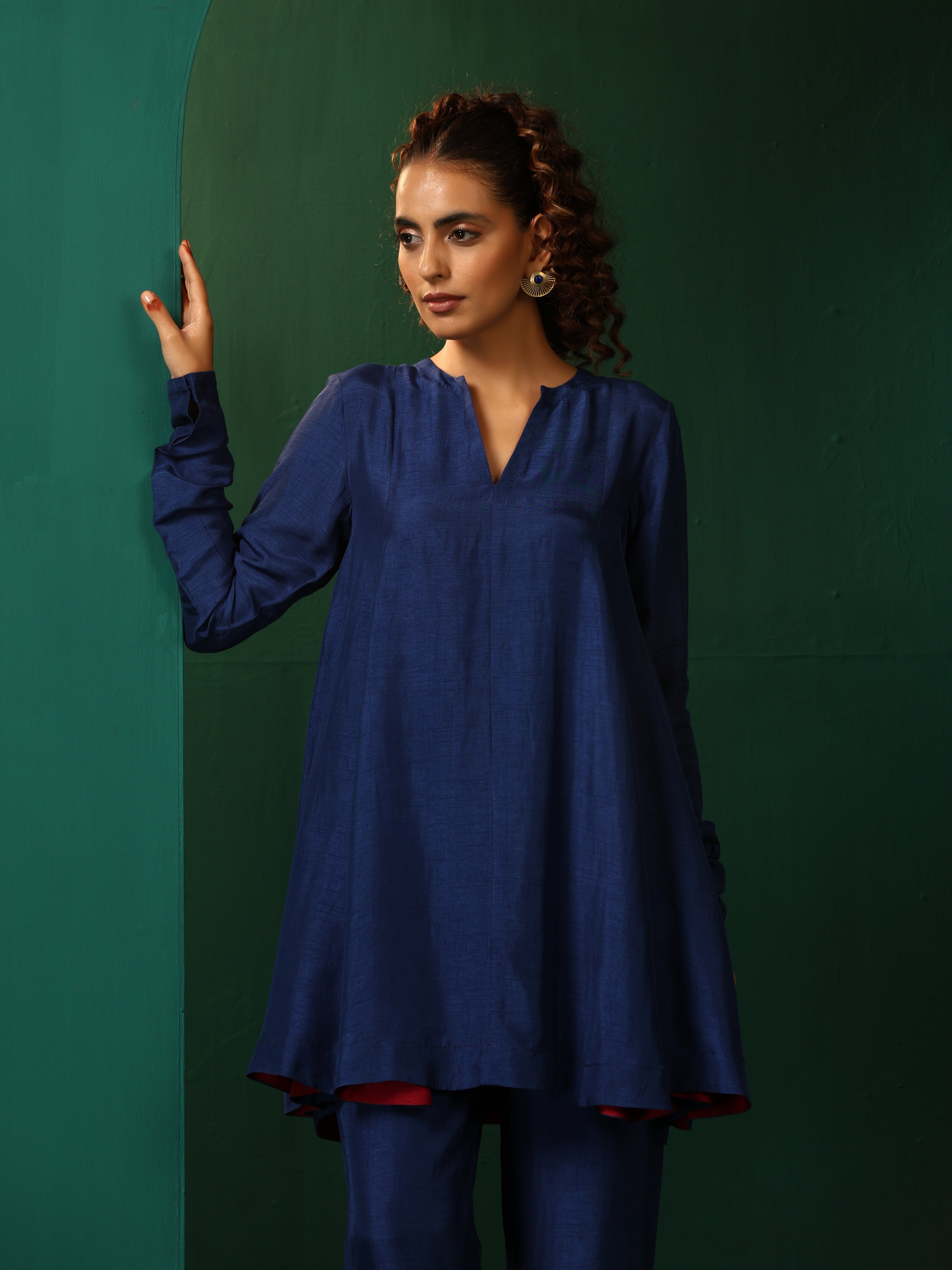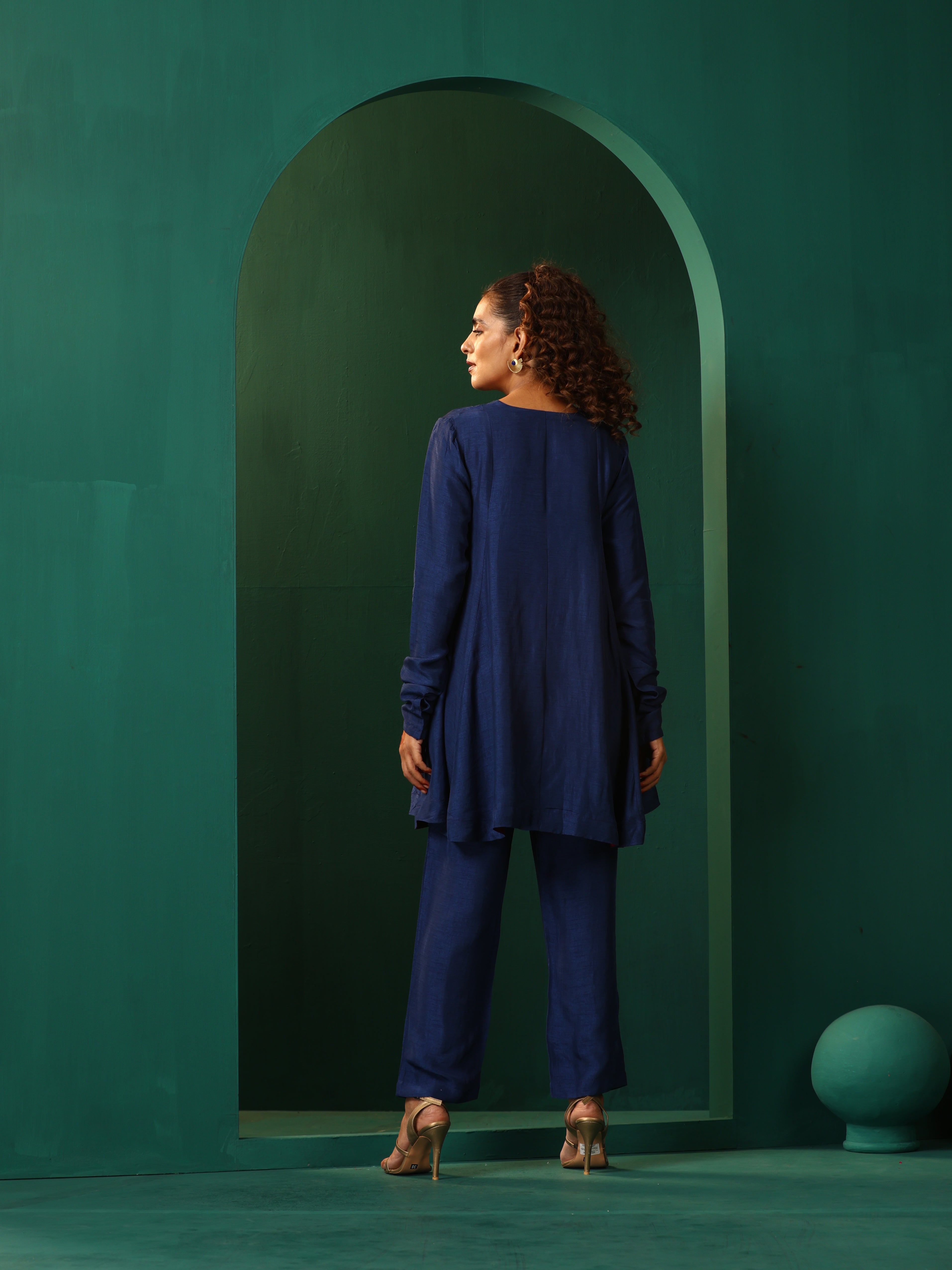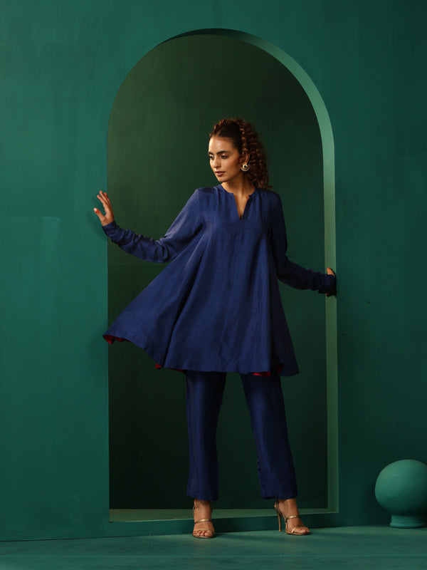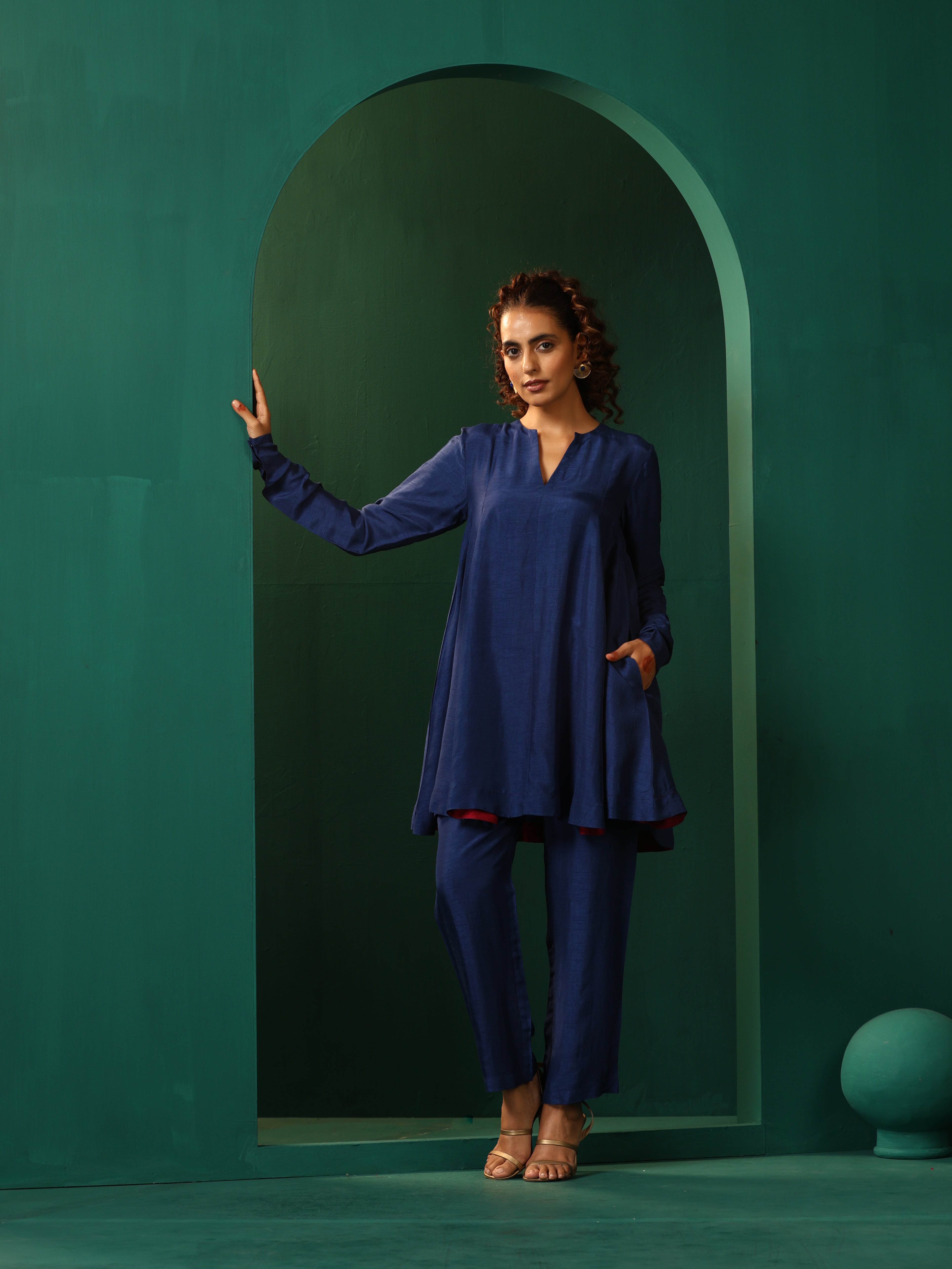 trueBrowns Blue Silk Flared Co-ord SetDescription Silk Blend Flared Co-ord Set with Round neck slit neckline and Churi sleeve. Paired with elastica...