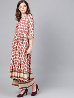 • Off-White and maroon pleated Anarkali calf-length kurta with tie-up detail, has a round neck, three-quarter sleeves, flared hem