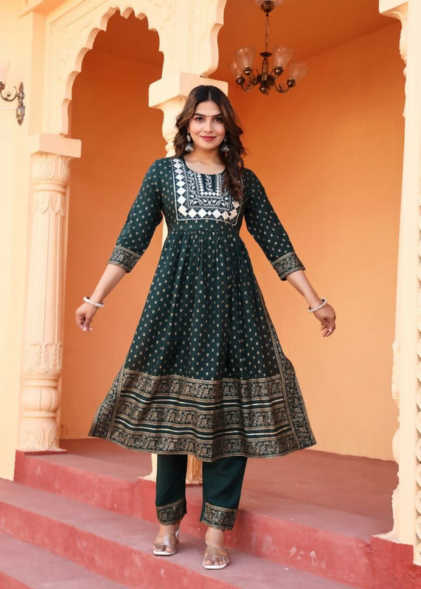 Alvano Women's Embroidery work Print Naira Cut Kurti with Pant and Dupatta set Rayon - M