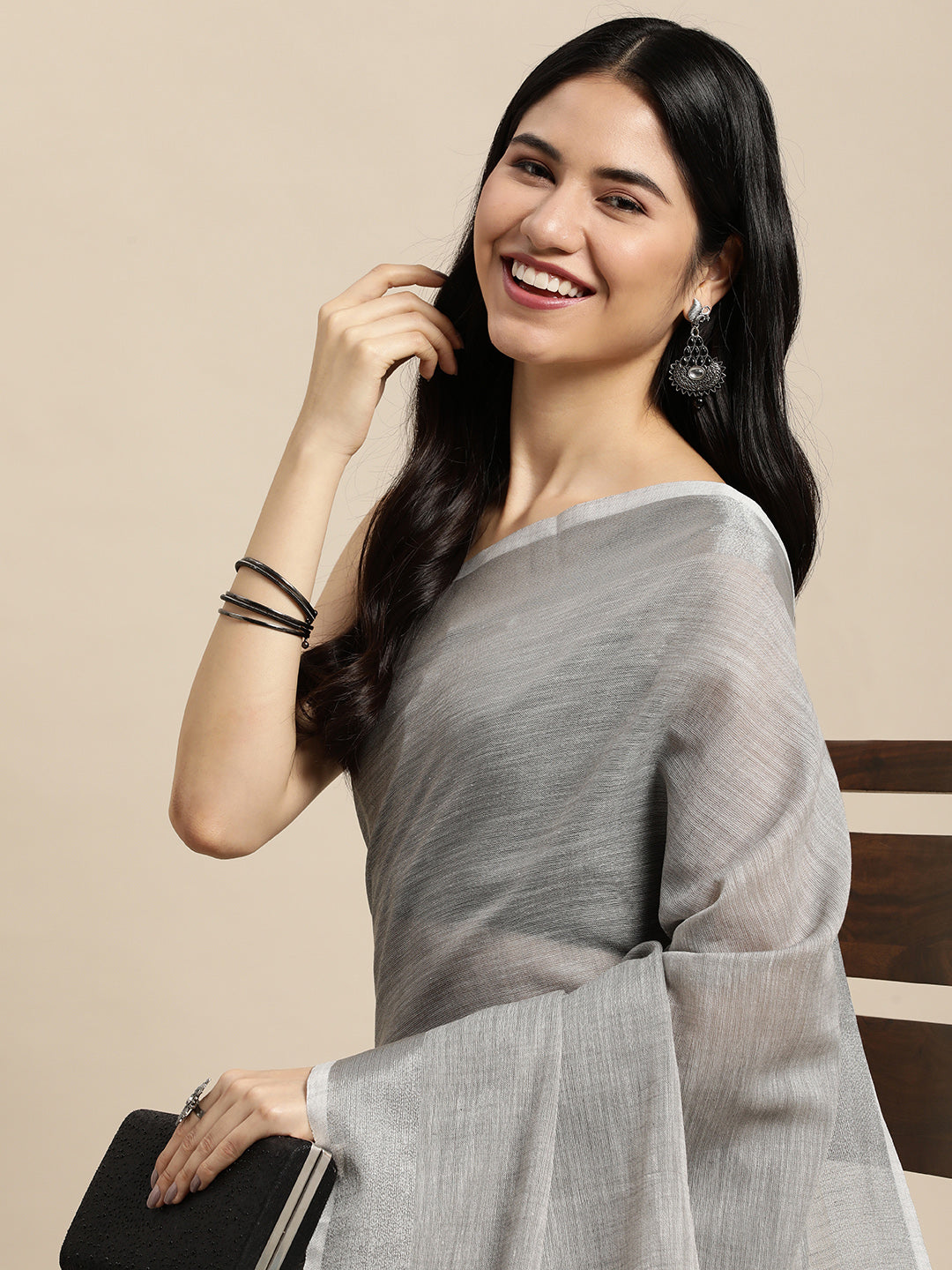 Soft as a whisper, light as a breeze.This Grey linen saree wraps you in comfort and grace, with delicate zari borders and tassels that add just the right touch of tradition. Perfect for days when you want to feel effortlessly beautiful.