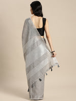 Astita Elegant Grey Woven Linen Saree with Contrast Zari Border & Tassels - Soft & Breathable Party Wear - Default Title