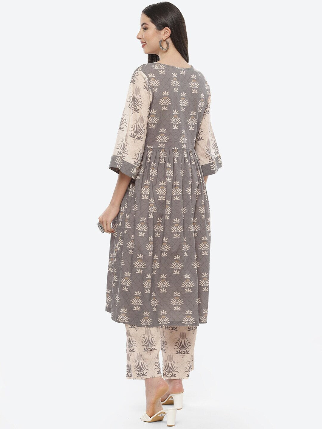 Biba Women Grey & Beige Ethnic Motifs Printed Pleated Pure Cotton Kurta with Palazzos