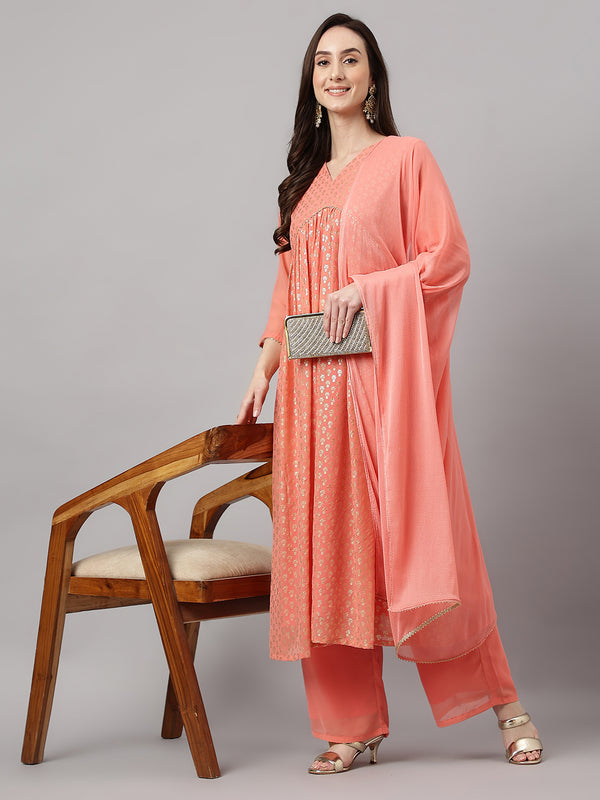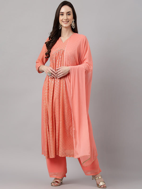 Janasya Women's Peach Georgette Foil Printed Gathered Festive Kurta Set