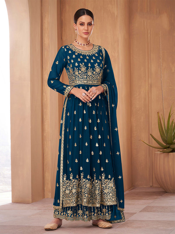 An superb Blue color georgette palazzo salwar suit will make you look too stylish and graceful. The ethnic embroidered, sequins and thread work work at the dress adds a sign of splendor statement with your look. Comes with matching georgette bottom and dupatta.