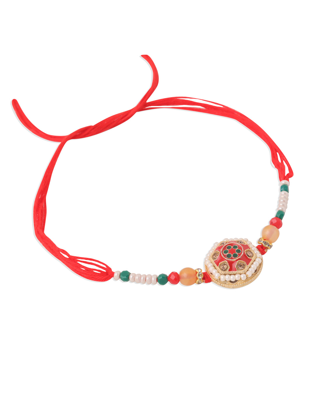 • Style Note: Celebrate the bond of love and protection with the NVR Set of 2 Red Artificial Stones and Beads Bhaiya Bhabhi Rakhi. Adorned with intricate artificial stones and beads, these Rakhis add a vibrant and festive touch to your celebration. Designed for both Bhaiya and Bhabhi, this set is perfect for expressing affection and blessings. The set includes Roli, Chawal, Chandan & Mishri to complete the traditional Raksha Bandhan rituals. A thoughtful and meaningful gift for your brother and sister-in-law on this special occasion.