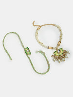 NVR Women & Men Set of 2 Green Lotus Shape Kundan-Studded & Beaded Wraparound Rakhi Set With Roli Chawal & Chocolate