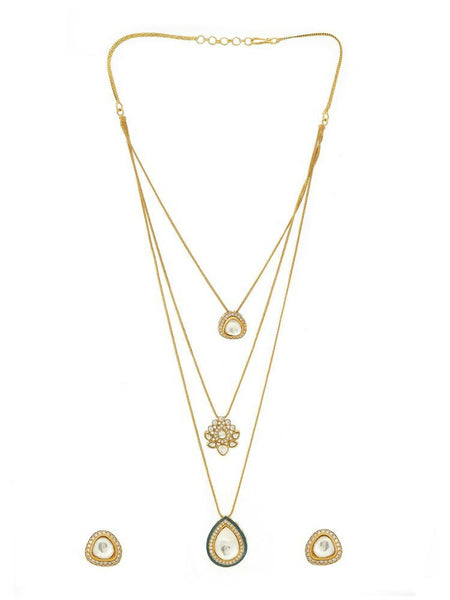 Expertly handcrafted, this elegant ensemble features luminous Kundan accents set against soothing mehendi tones for a rich, ethnic appeal. The necklace is designed with a graceful dew drop-shaped pendant that adds fluid elegance and draws the eye. Complementary earrings echo the same delicate form, creating a beautifully balanced look. Lightweight and versatile, this set is ideal for festive wear, traditional gatherings, or wedding celebrations. Style tip: Pair it with a pastel or jewel-toned outfit to let the pendant’s gentle shimmer truly shine.