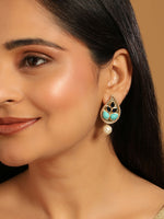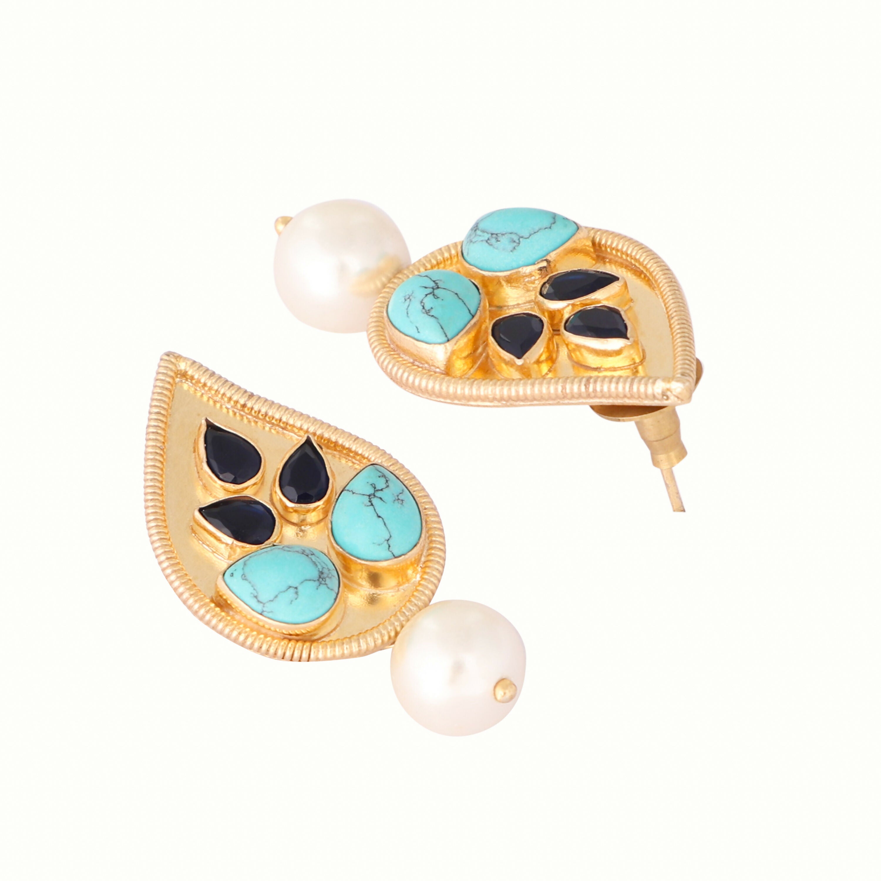 22k gold-plated paisley earrings adorned with turquoise and black stones, enhanced by pearl drop. Secured with a post and back closure.
