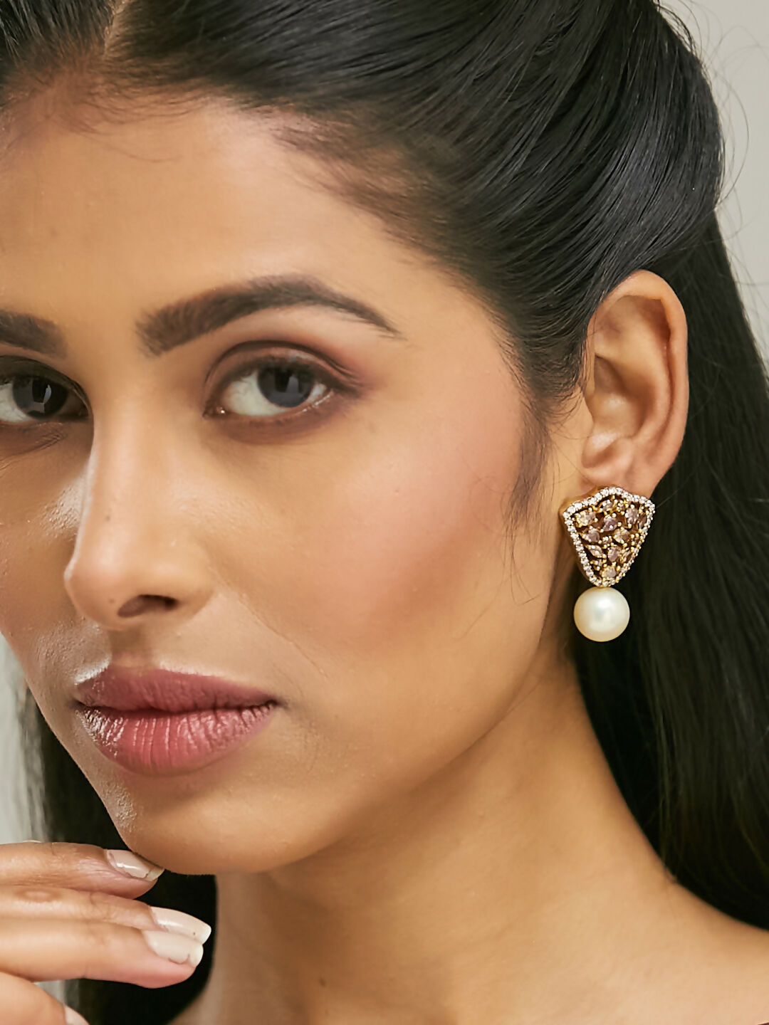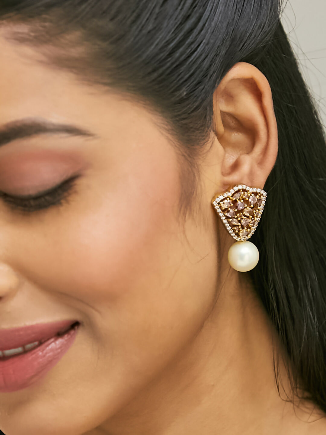 Nuyug 22K Gold-Plated Elegant Zircon Stone Studded & Pearls Drop Stud EarringsAbout the product:22 k Gold-toned, pink stone contemporary floral...