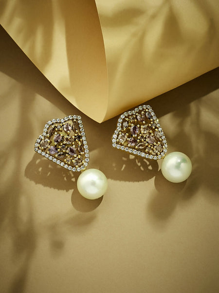 Nuyug 22K Gold-Plated Elegant Zircon Stone Studded & Pearls Drop Stud Earrings