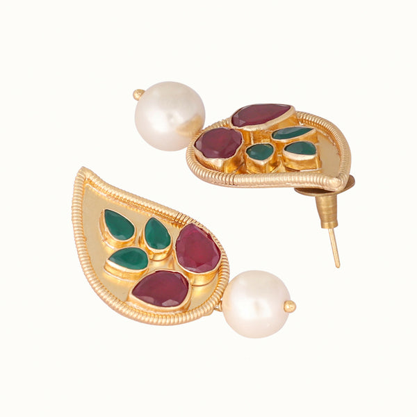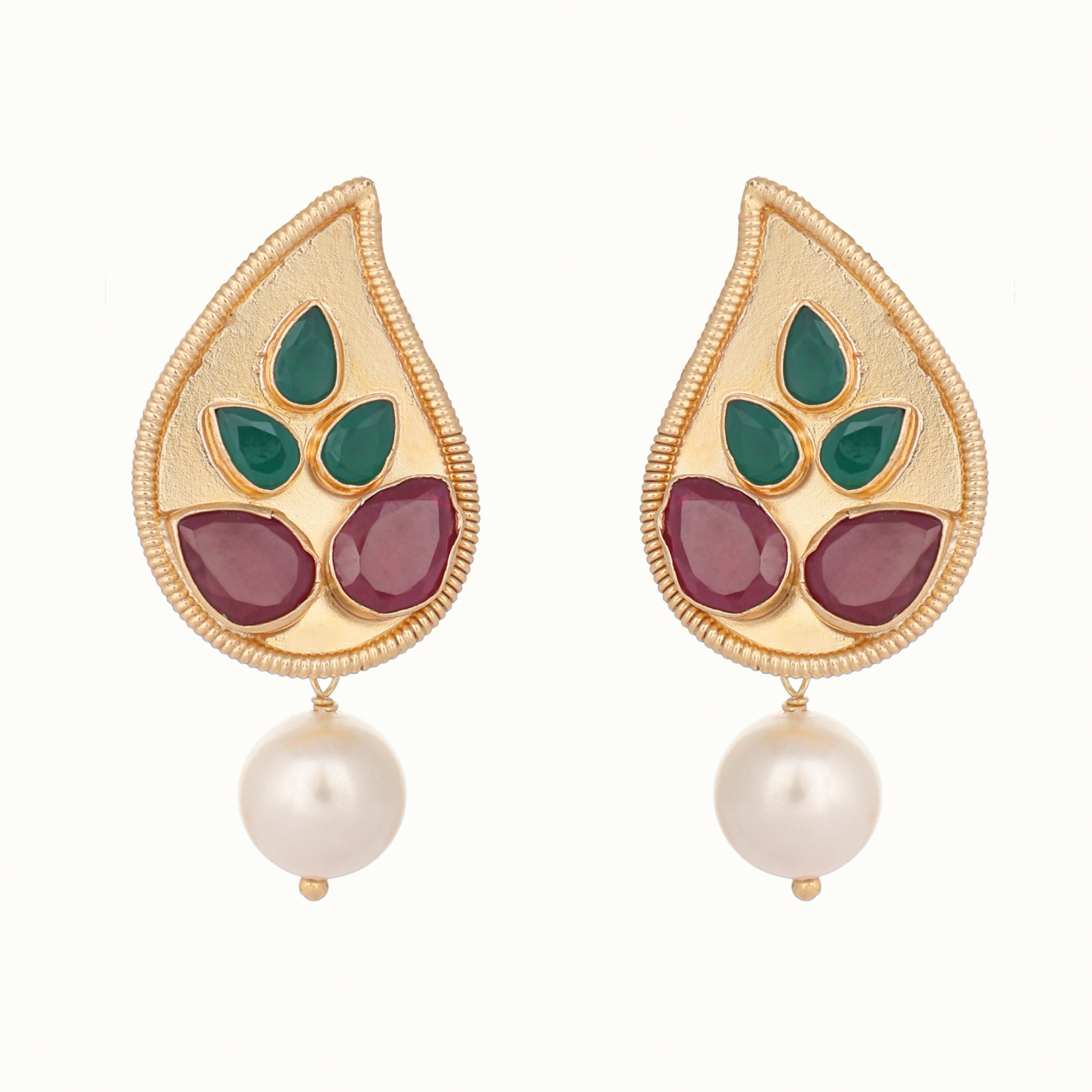 22k gold-plated paisley earrings adorned with ruby stones, enhanced by pearl drop. Secured with a post and back closure.
