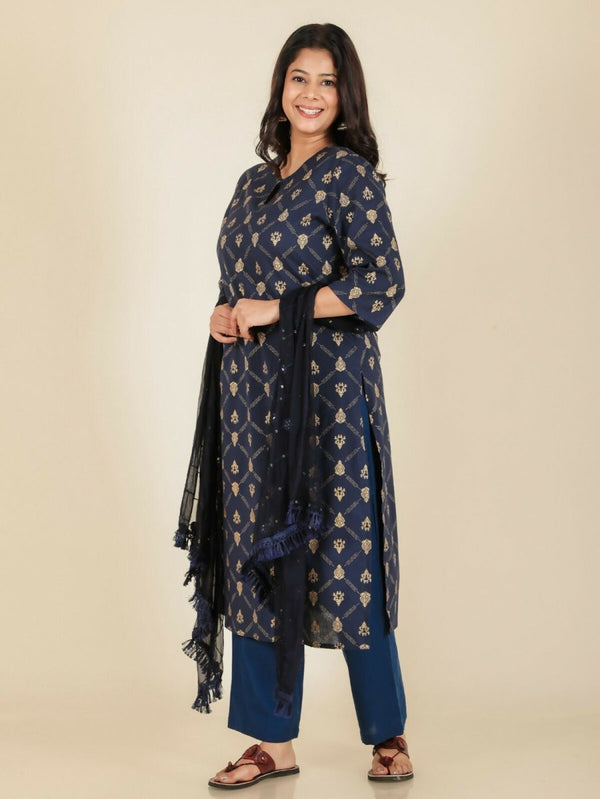 Aramya Straight Soft Cotton Floral Print Women's Kurta Set - Blue - M