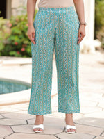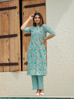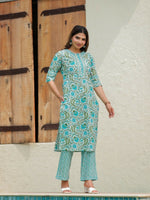 Aramya Straight Soft Cotton Floral Print Women's Kurta Set - Turquoise