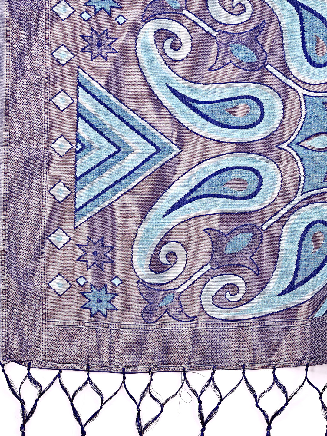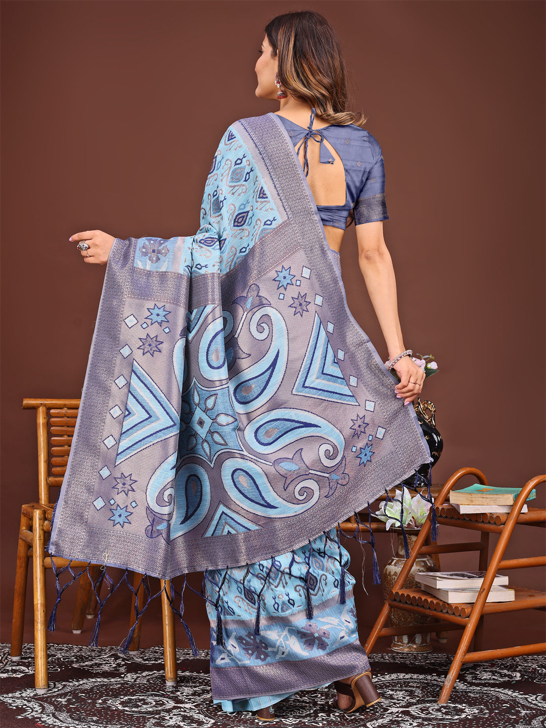 Step into timeless beauty with this exquisite Sky blue Patola linen cotton saree, a blend of tradition and modern charm. Crafted from a breathable cotton-linen fabric, it showcases intricate Patola-inspired motifs in elegant sky blue tones that reflect Indian heritage. The rich pallu design with symmetrical geometric patterns and playful tassels makes it perfect for festive gatherings, office wear, or heartfelt celebrations. This saree is more than an outfit — it’s a story of heritage, woven with grace and poise.