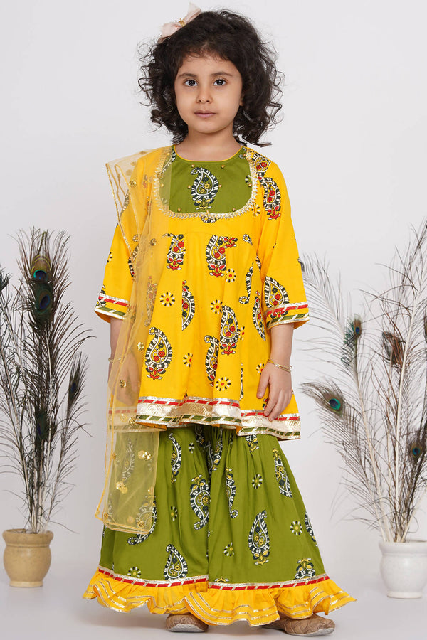 Little Bansi Cotton Floral Jaipuri Kurta with Gunghroo work, Frill Sharara and Dupatta - Yellow and Green