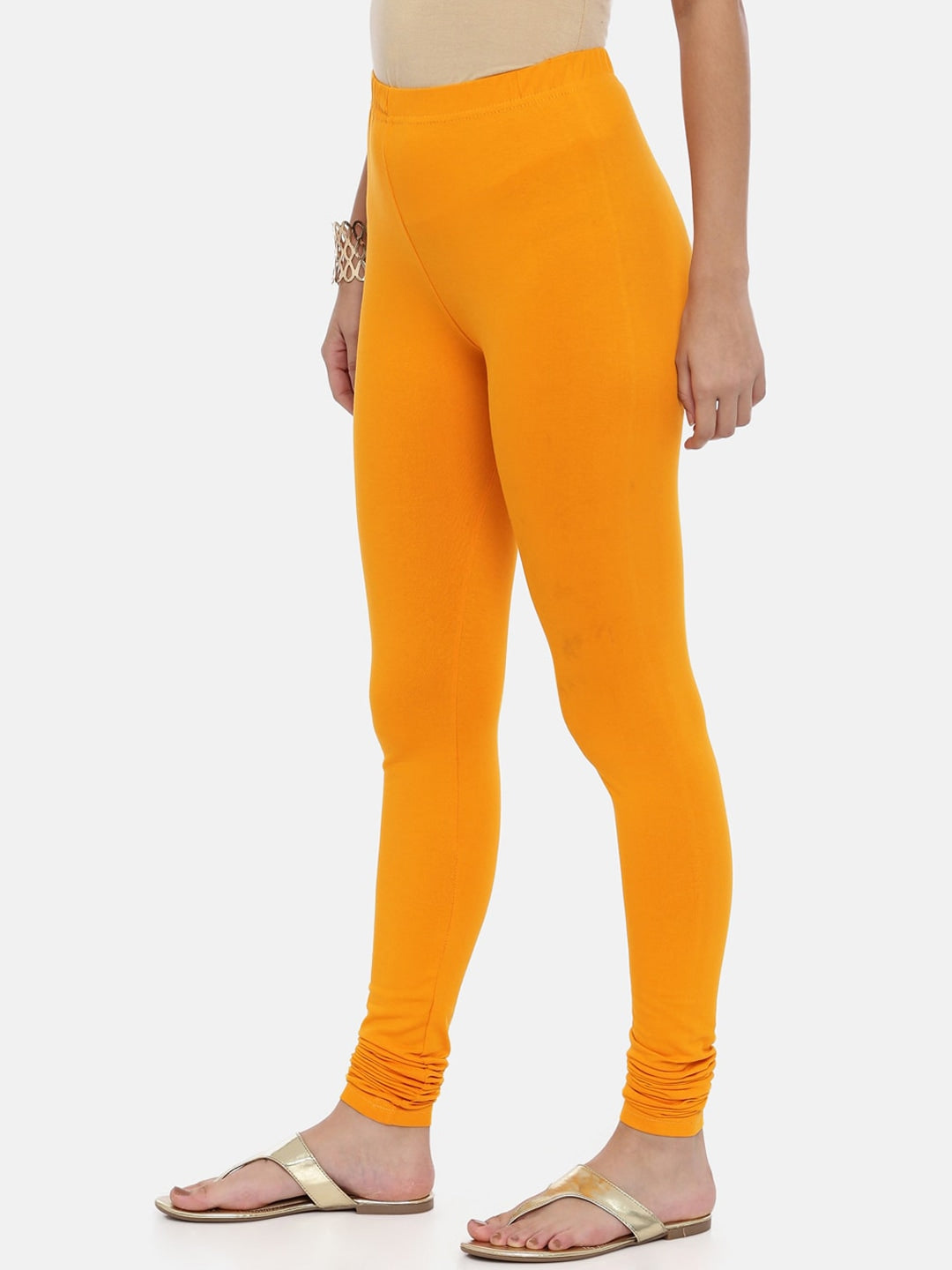 Mustard yellow solid slim-fit churidar-length leggings, has an elasticated wiastband, and slip-on closure