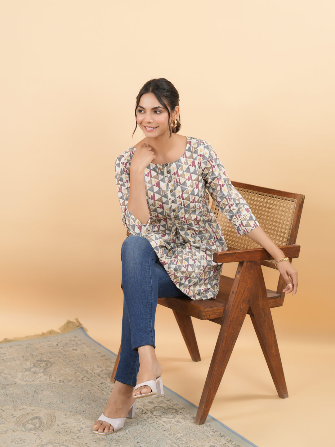 Janasya Off White Cambric Gemometric TunicAbout the Product: Top Style Type: Regular Top Fabric: Cambric Top Primary Color: Off White Top Patte...