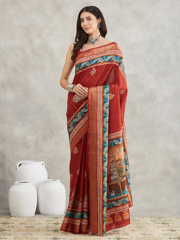 Janasya Rust Silk Blend Paisley Printed Saree
