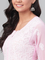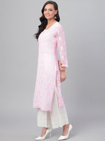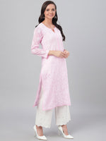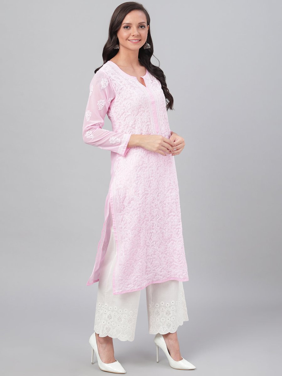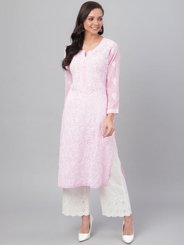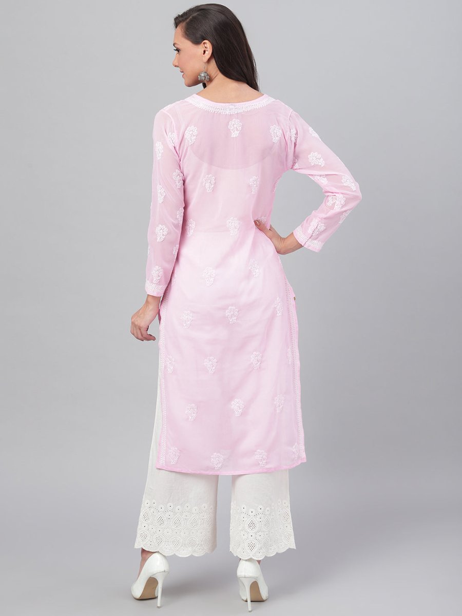 Pink and white?Chikankari hand?embroidered straight kurta, has a round neck, three-quarter sleeves, straight hem, and side slits