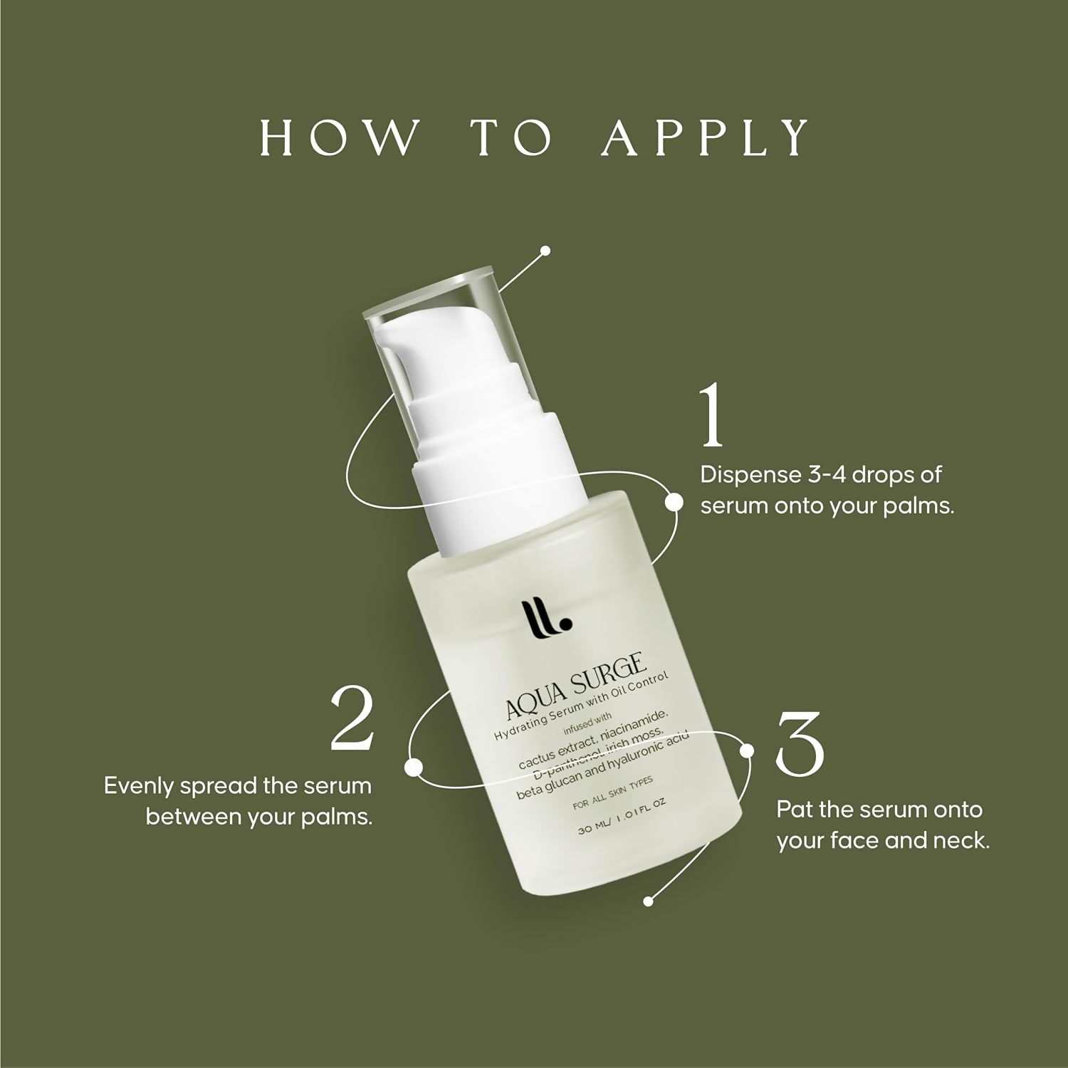 • Take 3-4 drops of Serum onto your palm. Evenly spread the serum between your palms with gentle motions.