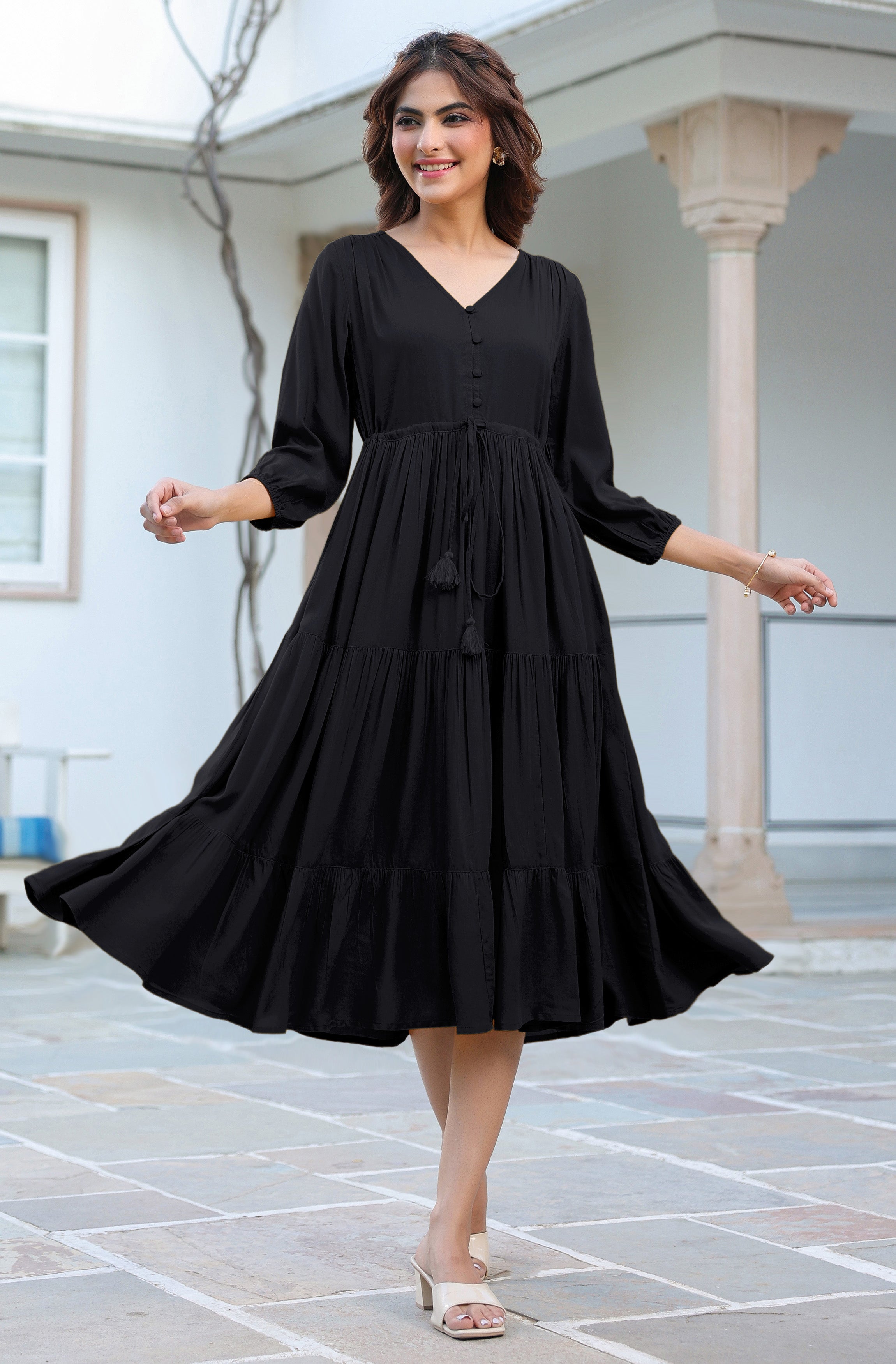 Janasya Dark Rayon Solid Tiered Dress Top Fabric: Rayon Top Style: Tiered Top Color: Dark Top Pattern: Solid Top Neck: VNeck Top Sleeve Detai...
