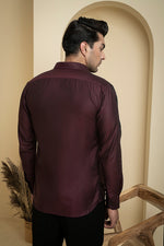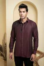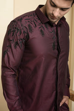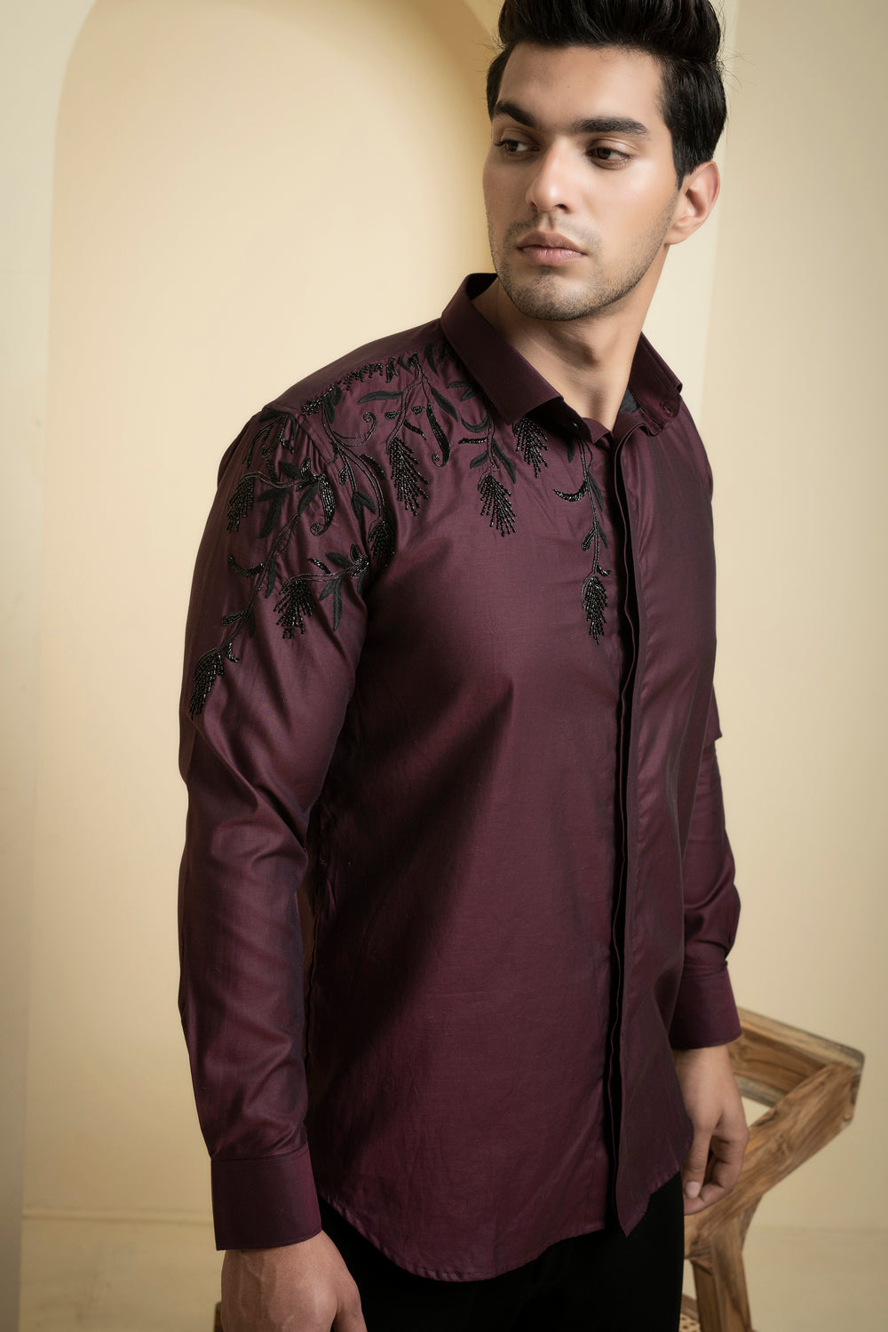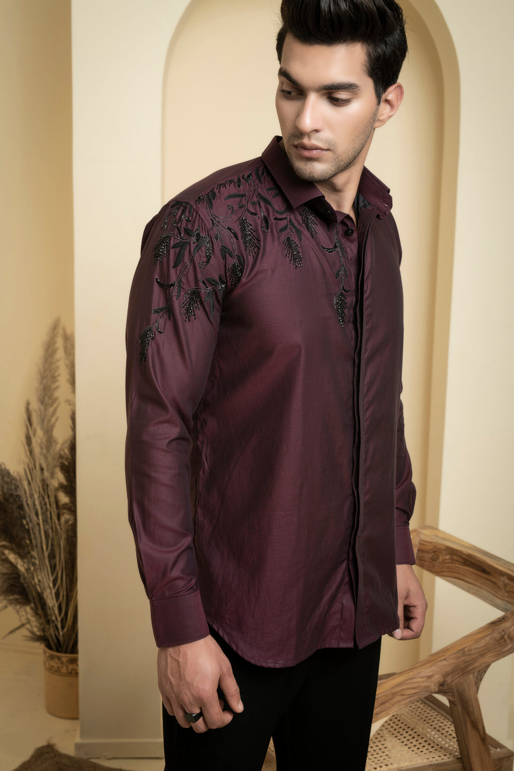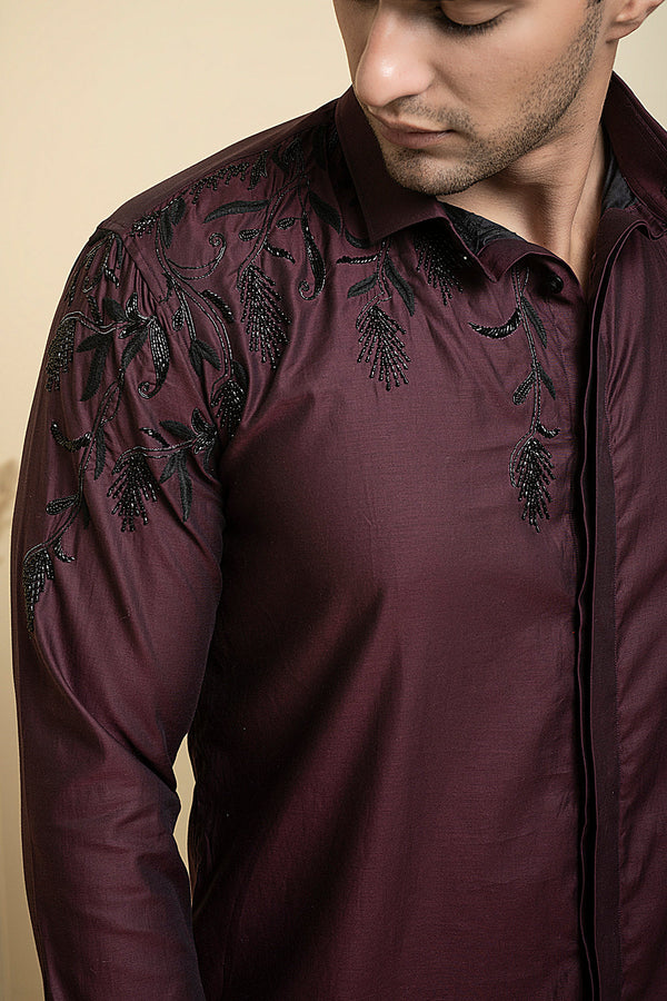 This burgundy shirt is made of premium Giza fabric, and features shimmering black embroidery on the right shoulder and sleeve. The intricate stitching adds a touch of elegance and sophistication to the shirt, making it perfect for a night out or a special occasion. The rich burgundy color adds depth and richness to the shirt, while the black embroidery provides a striking contrast. This is a versatile and stylish shirt that will elevate any outfit